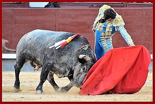 Pour l’anecdote, une photo m’a été transmise, celle d’un jeune aficionado porteur d’une muleta qui sur le trajet de la maigroulette manif les nargua tout en restant correct. En torero. Olé !
