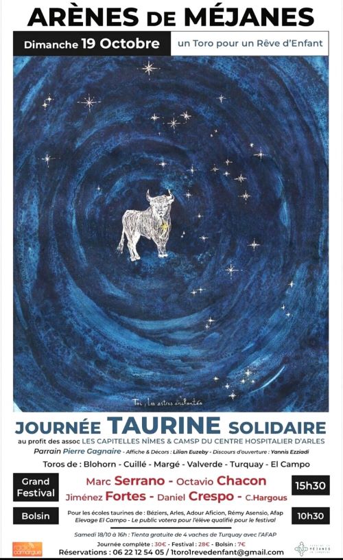 On espère que le public viendra nombreux pour soutenir cette cause en passant un bon moment. La cavalerie sera celle de Philippe Heyral, la musique celle de Beaucaire. Je me dois aussi de mentionner le soutien de la famille Guillot sans quoi rien ne serait possible, tout comme celui de Michèle Ricard et son équipe, puis le vétérinaire, l’équipe médicale, les areneros, ainsi que quelques partenaires…