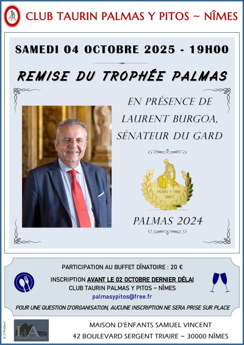 Comme voté en AG, le CT Palmas y Pitos recevra le samedi 4 octobre le Sénateur du Gard, M. Laurent BURGOA, pour lui remettre son Trophée PALMAS 2024.