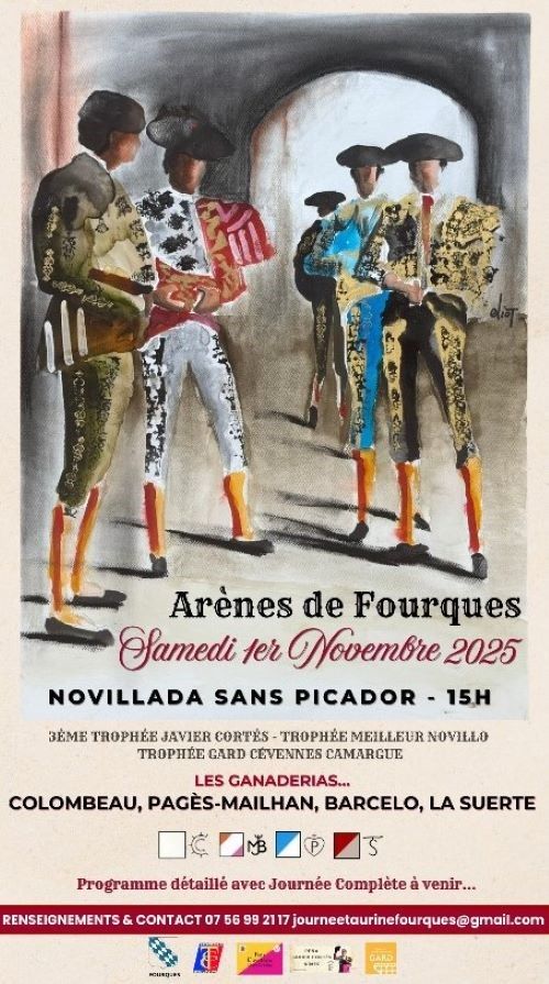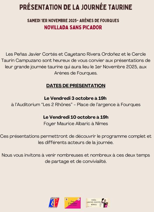 Les Peñas Cayetano Rivera Ordóñez  et Javier Cortés ainsi que le Cercle Taurin Campuzano ont le plaisir de vous convier aux présentations de la grande Journée Taurine qui se déroulera le samedi 1er novembre 2025, aux Arènes de Fourques, avec notre novillada sans picador qui clôturera la temporada…