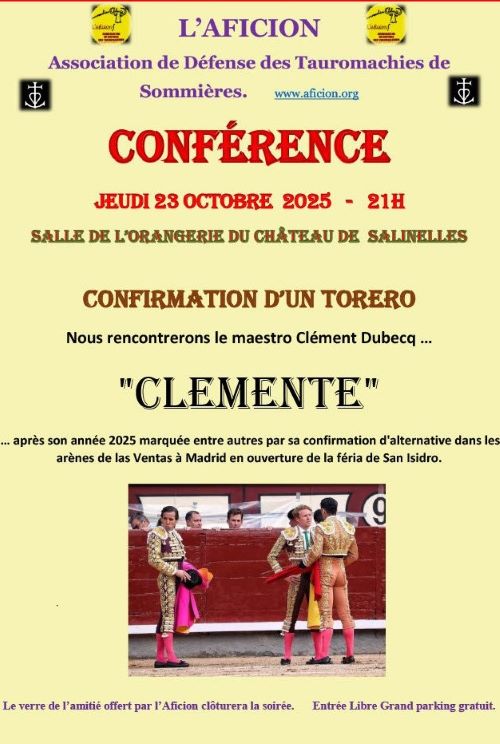 Prochaine conférence de l’Aficion de Sommières le jeudi 23 octobre : rencontre avec le maestro Clément Dubecq « CLEMENTE »…
