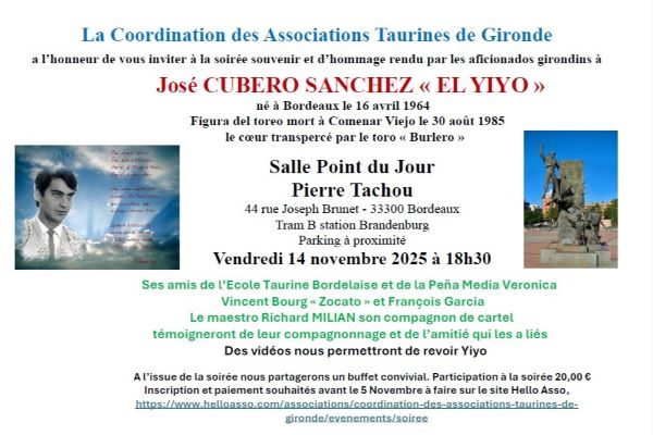 Le 14 novembre prochain, à l’occasion des 40 ans de sa mort tragique, les aficionados girondins veulent rendre un hommage plein d’émotion à José Cubero « YIYO », né à Bordeaux le 16 avril 1964, matador, figura del toreo, mort à Colmenar Viejo le 30 août 1985, le coeur transpercé par le toro « Burlero ».