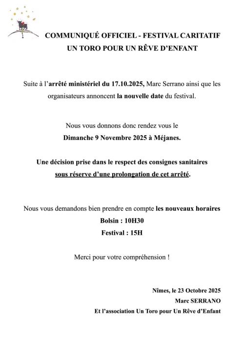 La date du report du Festival 2025 « Un Toro pour un Rêve d’Enfant » est à présent connue…