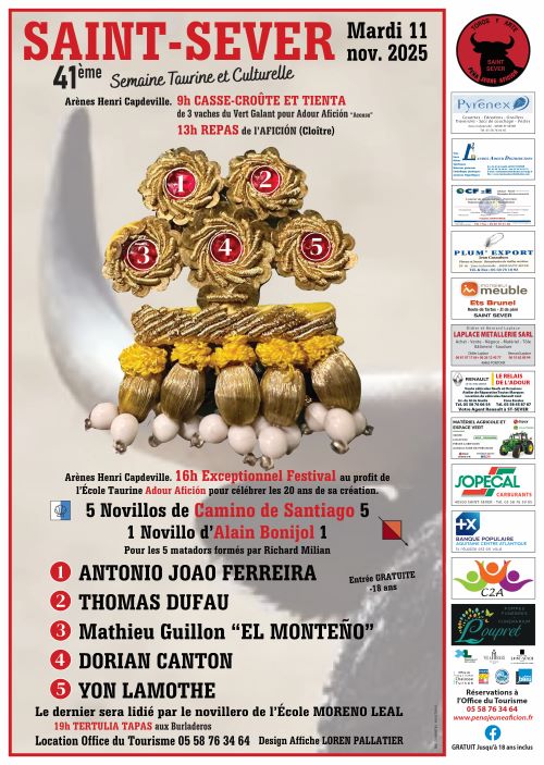 16h00 : Festival aux arènes avec le même programme et les mêmes acteurs que le 19 octobre : 5 novillos de Camino de Santiago et 1 novillo d’Alain Bonijol pour Antonio Joao Fereira, Thomas Dufau, Mathieu Guillon « El Monteño », Dorian Canton, Yon Lamothe et Moreno Leal.