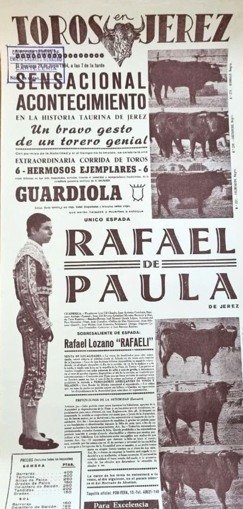 L’histoire de ce Rafael de Paula tourne en rond et après une cinquantaine de novilladas, il prend l’alternative à Ronda des mains d’Aparcio, en présence d’Ordóñez. Entre moral en baisse, embrouilles, changement d’apoderados, échecs en piste, le genou qui flageole, le service militaire, le gitan ne se voit pas offrir beaucoup d’opportunités. L’histoire aurait pu en rester là. Rafael tente un coup de poker et s’annonce à Jerez seul face à six Guardiola en juin 1964, il coupe 8 oreilles. C’est le triomphe ! Ce triomphe lui ouvre les plaza de son « rincón ». Il répétera un solo au Puerto moins triomphal que celui de Jerez, mais en laissant son empreinte.