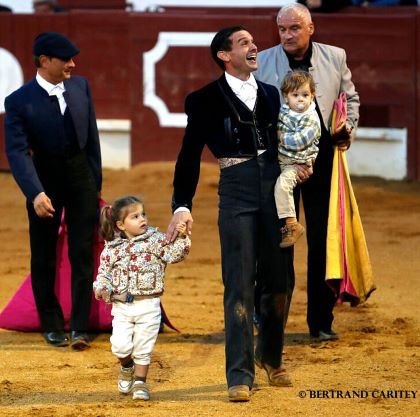 Mathieu Guillon força le destin en accueillant le Camino à portagayola et poursuivit à la cape, frôlant la perfection dans les chicuelinas et les quites. Citant en duo avec Thomas, on retrouva les banderilleros d’antan qui avaient invité le jeune Clovis. Citant de loin, il ouvrait sa faena à genoux. Ce furent des instants très animés et toujours précis, jusqu’à ce que prenant trop confiance il était bousculé pour une voltereta sans gravité. Il gagna une oreille partagée avec ses enfants qu’il entraînait dans sa vuelta.