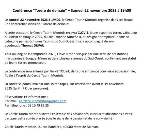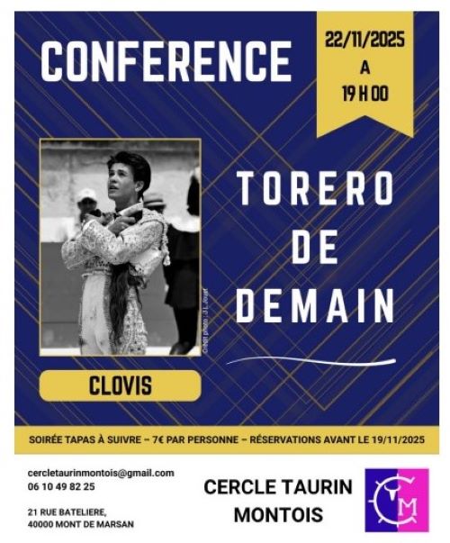Conférence sur le thème « Torero de demain » avec le novillero Clovis, le samedi 22 novembre à Mont de Marsan…