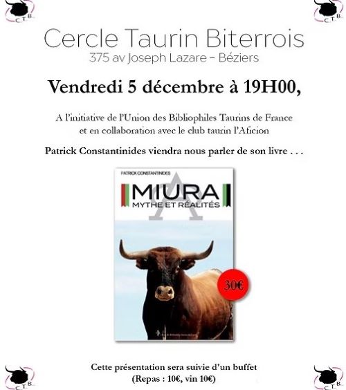 A Béziers, le Cercle Taurin Biterrois, en collaboration avec le CT l’Aficiión, propose le vendredi 5 décembre une rencontre avec Patrick Constantinides qui présentera son livre sur Miura…