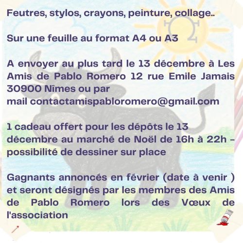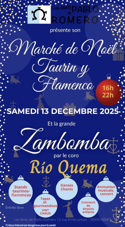 Avec les Amis de Pablo Romero de Nîmes, diverses activités et découvertes sont proposées le samedi 13 décembre : Marché de Noël Taurin et Flamenco, Zambomba, Musique, Danse, Concours de dessin…