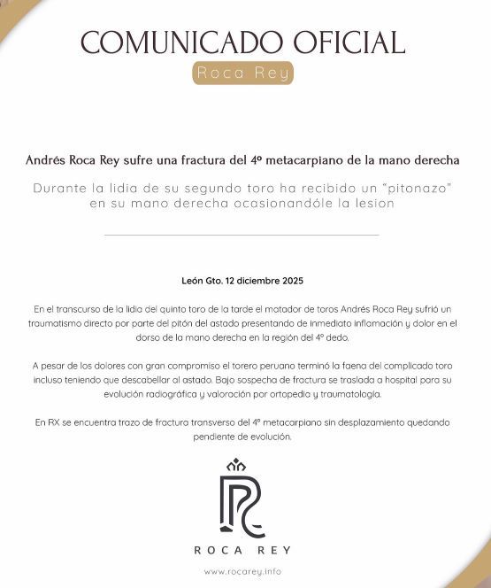 Le maestro péruvien Andrés Roca Rey a été blessé à León (Mexique) où une fracture du quatrième métacarpe de sa main droite a été diagnostiqué…