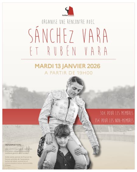 Afin de bien commencer l’année, nous vous donnons rendez-vous ce mardi 13 janvier pour la soirée conférence et tapas en présence du Maestro Sánchez Vara, ainsi que son fils le novillero Rubén Vara ! 🐂
