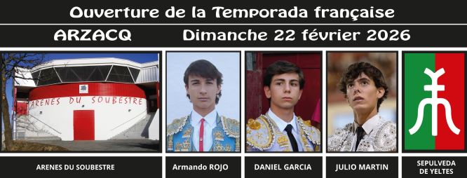 Sous les caméras de Canal Sur TV, sa personnalité, son temple et sa planta taurine lui ont valu de couper les deux oreilles et la queue de son novillo de Garcigrande et d’être déclaré vainqueur face à 11 autres prétendants. Sélectionné pour le Zapato de Plata d’Arnedo, de l’Alfarero de Plata de Villaseca et avant de se produire à Valdemorillo en mars, Armando ROJO sera à suivre avec beaucoup d’intérêt pour sa présentation dans les arènes arzacquoises…
