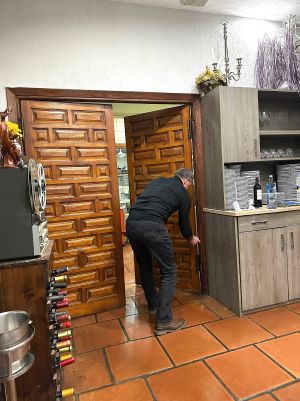 Aussi, lorsque le maestro Le Sur lui dit que les portes battantes en bois sculpté qui menaient à la cuisine faisaient vraiment trop de bruit, elle est revenue immédiatement avec une petite burette de 3 en 1, avec un petit sourire coquin de défi. A ce moment, Alain, un de nos compagnons de cartel, n’écoutant que son courage, alla appliquer de la précieuse huile sur tous les endroits de frottement, sous les vivats de l’assistance. Nous étions comme chez nous et il nous plaisait d’améliorer cet endroit si accueillant !