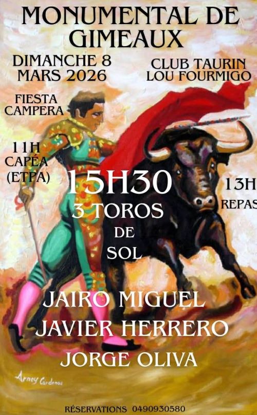 Rappel (avec un changement) : Organisée par le CT Lou Fourmigo, cette journée verra notamment l’après-midi les matadors Jairo Miguel, de Cáceres – venant remplacer Alfonso Oliva Soto -, Javier Herrero, de Cuéllar et le novillero madrilène Jorge Oliva combattre du bétail de Sol.