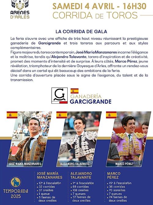 Les toros de la ganadería de Garcigrande fouleront le sable des Arènes d’Arles le samedi 4 avril pour une corrida qui réunira José María Manzanares, Alejandro Talavante et le jeune prodige Marco Pérez.
