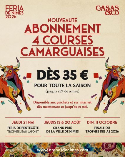 Abonnements disponibles jusqu’au 21 mai, jour de la première course, aux guichets 4 rue de la Violette à Nîmes et sur notre billetterie en ligne.
