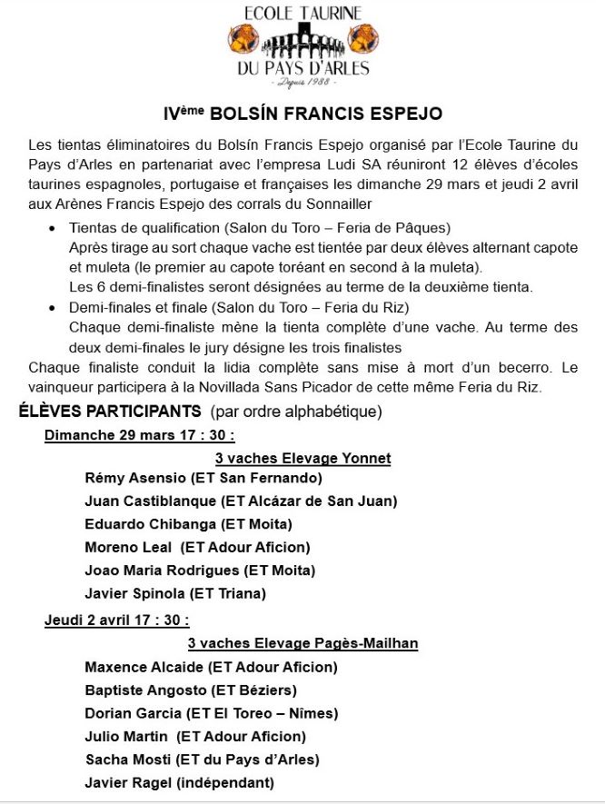 Tous les détails sur les éliminatoires du IVe Bolsín Francis Espejo qui se dérouleront les 29 mars et 2 avril dans la placita du Sonnailler…