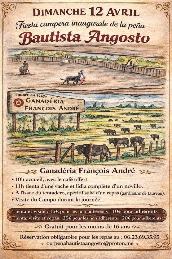 Le dimanche 12 avril, à la ganadería François André, fiesta campera d’inauguration de la peña taurine Bautista Angosto…