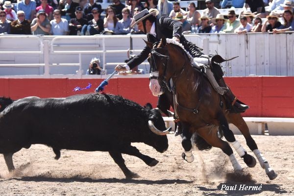 Léa, opposée à Dolorosa, toréa en 2ème position. Elle reçut et châtia ce N° 9 avec Guitarra : 2 castigos jumeaux. Elle nous régala ensuite de 3 bons bâtons avec Diluvio, quittant la piste aux changements de pieds à chaque foulée. Avec Pantera, ce sont 2 banderilles qui furent citées au Terre-à-terre. Fermín prenant le relais avec 1 banderille al violín, suivi d’une belle levade. Deux courtes et une rose avant de sortir au passage.