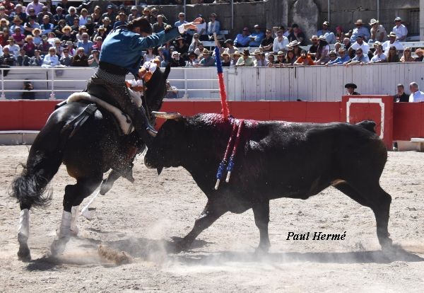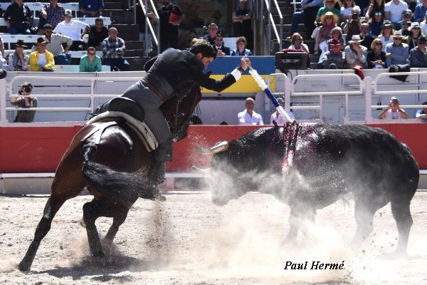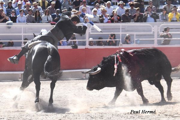 Avec le dernier de la matinée, le jeune Hermoso allait ouvrir la Grande Porte. Papeleiro, sans doute le plus impressionnant de tête, fut reçu par Jibaro pour 2 castigos, le second un peu trasero fut cloué de face. A souligner 2 belles poses de banderilles à l’étrier avec Navegante. Deux de plus sont à attribuer à Medellín. Quelques passages à vide volontaires sont à souligner pour templer la charge en pesant sur le Papetier. Le bai qui en fut l’auteur est un petit-fils de Pata-Negra.