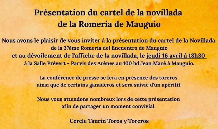 Présentation du cartel de la novillada de la 37ème Romería del Encuentro le jeudi 16 avril à 18h30…