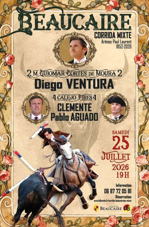 A 19h : deux toros de Guiomar Cortes de Moura pour Diego Ventura et quatre de Calejo Pires pour Clemente et Paco Aguado, bref du bétail portugais pour le rejoneador et les deux diestros, organisation du Club Taurin Beaucairois…